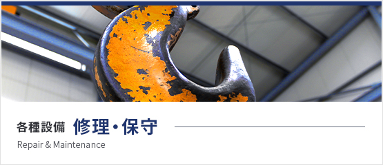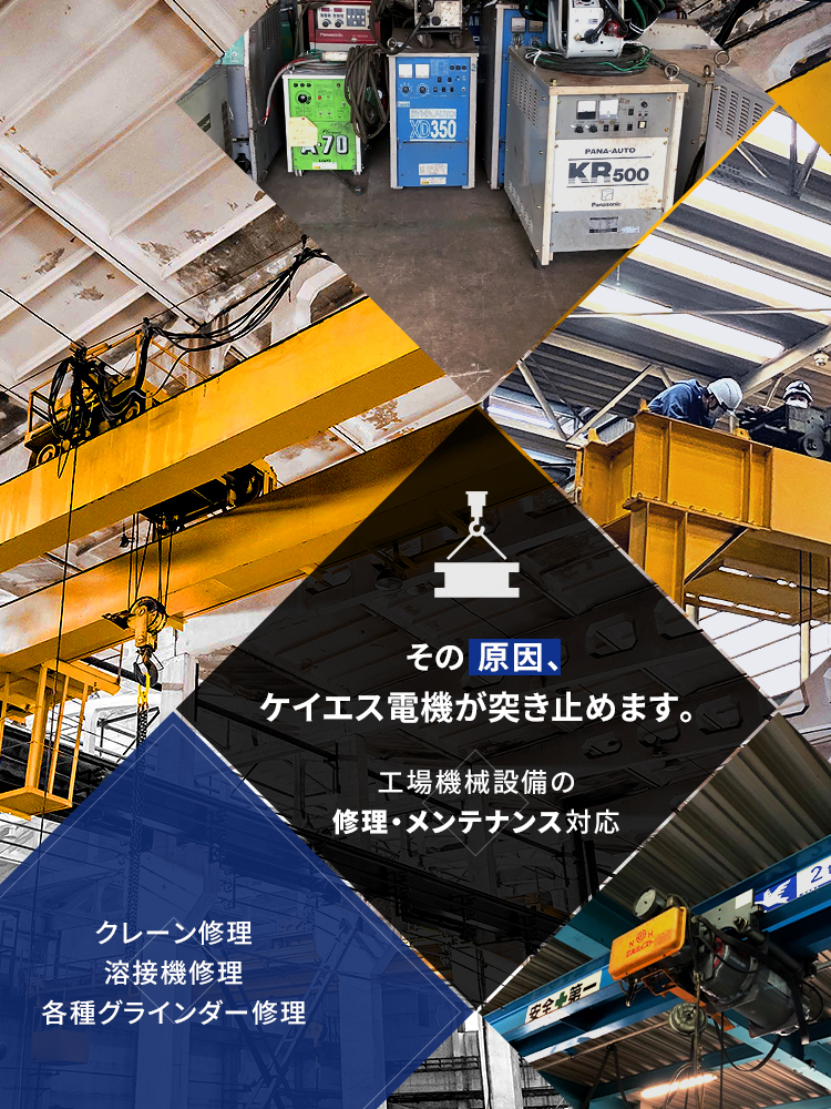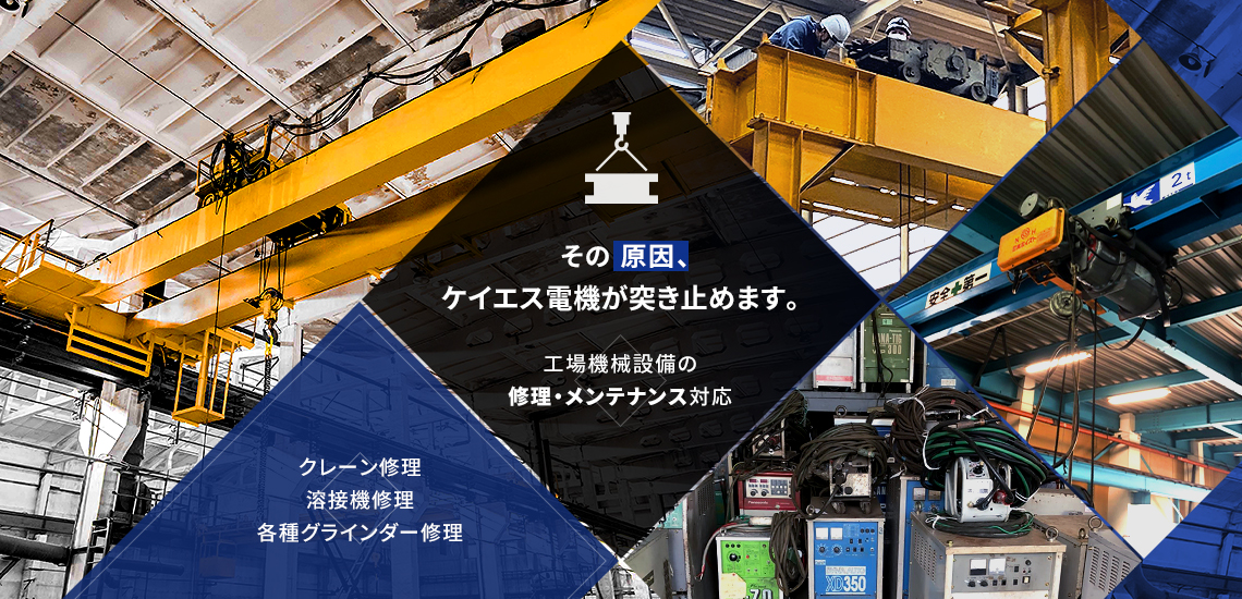 ケイエス電機は、工場内機械設備のメンテナンス・修理を専門としています。クレーンの法定点検・修理をはじめ、溶接機やグラインダーの修理など、これまで数々の工場内設備に対応してまいりました。